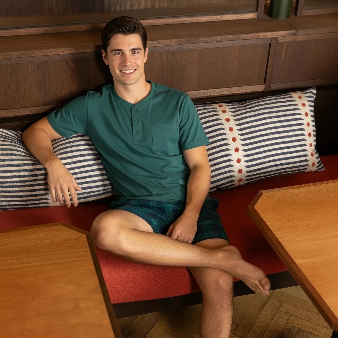 Dieser Charlie Choe Herren-Shortama in Smaragdgrün ist perfekt für Sommernächte und entspannte Momente zu Hause. Das Pyjama-Set besteht aus einem einfarbigen grünen Herren-Pyjamahemd mit kurzen Ärmeln, Knopfleiste und Brusttasche, kombiniert mit einer Pyjamashorts mit verspieltem grün-blauem Karomuster. Der Stoff aus 100 % Baumwolle fühlt sich weich und atmungsaktiv an und bietet optimalen Tragekomfort an warmen Tagen und Nächten. Dieser Charlie Choe Shortama verbindet praktische Bequemlichkeit mit einem frischen und zeitlosen Look, ideal für unbeschwerte Sommerabende.