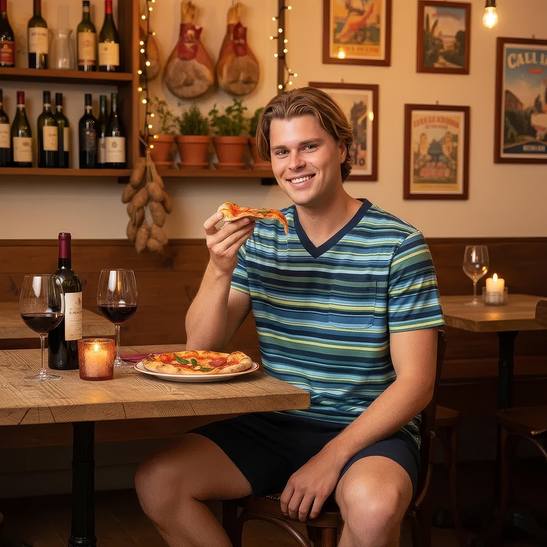 Dieser Charlie Choe Herren-Shortama in Navy ist eine bequeme Wahl für warme Sommernächte. Das Set besteht aus einem gestreiften T-Shirt mit V-Ausschnitt und Brusttasche, kombiniert mit einer einfarbigen dunkelblauen Pyjamashorts. Der Stoff aus 100 % Baumwolle fühlt sich weich, atmungsaktiv und leicht an und ist ideal für einen erholsamen Schlaf und entspannte Abende zu Hause. Dieses Charlie Choe Shortama bietet praktischen Komfort mit einem frischen und zeitlosen Look, perfekt für unbeschwerte Momente.