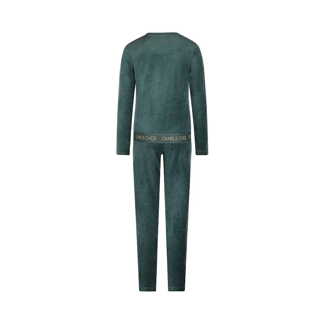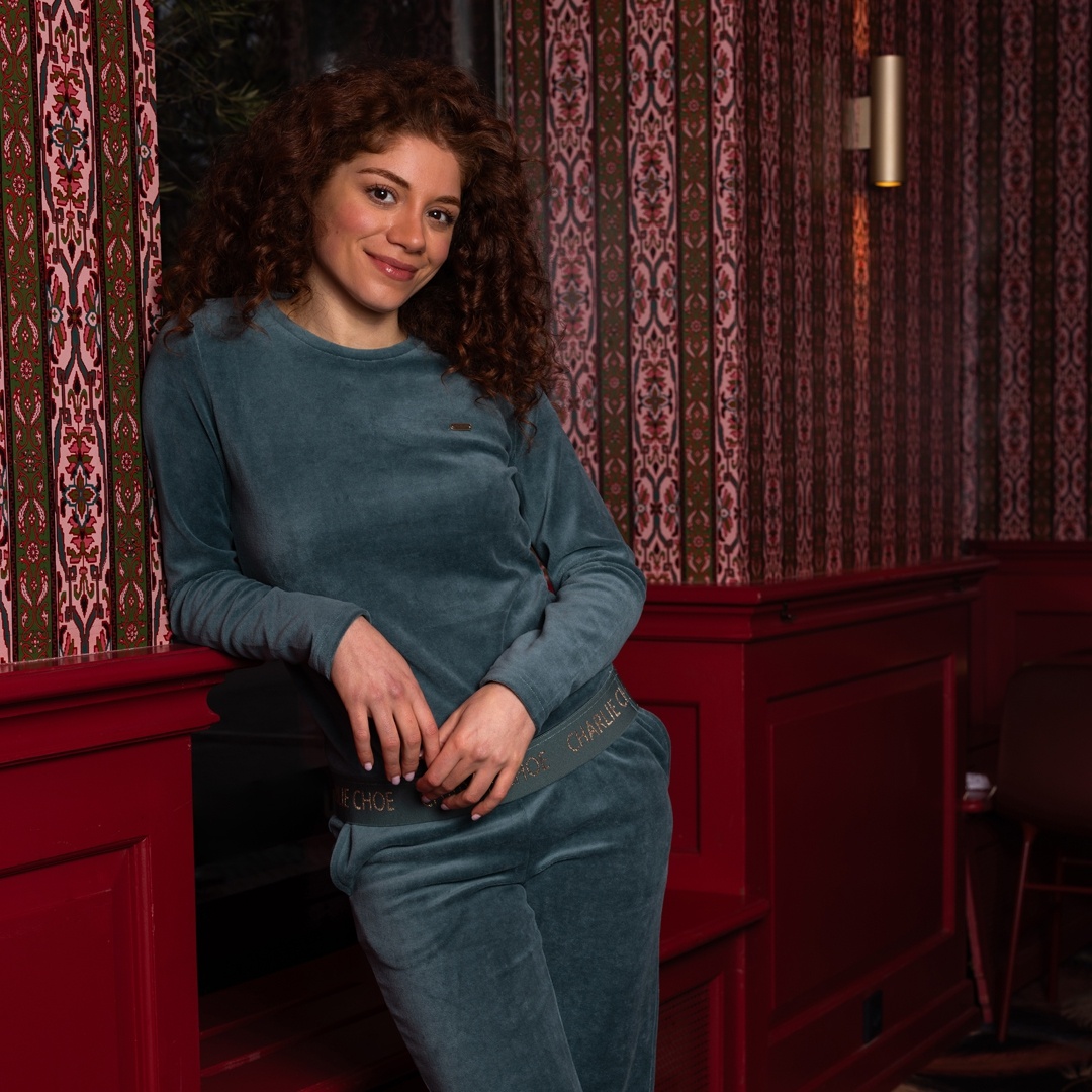 This pyjama set from Charlie Choe in deep blue-green feels wonderfully soft and stands out for its calm, refined look. The women's pyjama set is made from soft velour and has a comfortable fit. The elasticated waistband with woven-in “Charlie Choe” logo adds a sporty touch to this cosy set, which can also be worn as loungewear or homewear. Ideal for relaxing evenings and cosy nights.