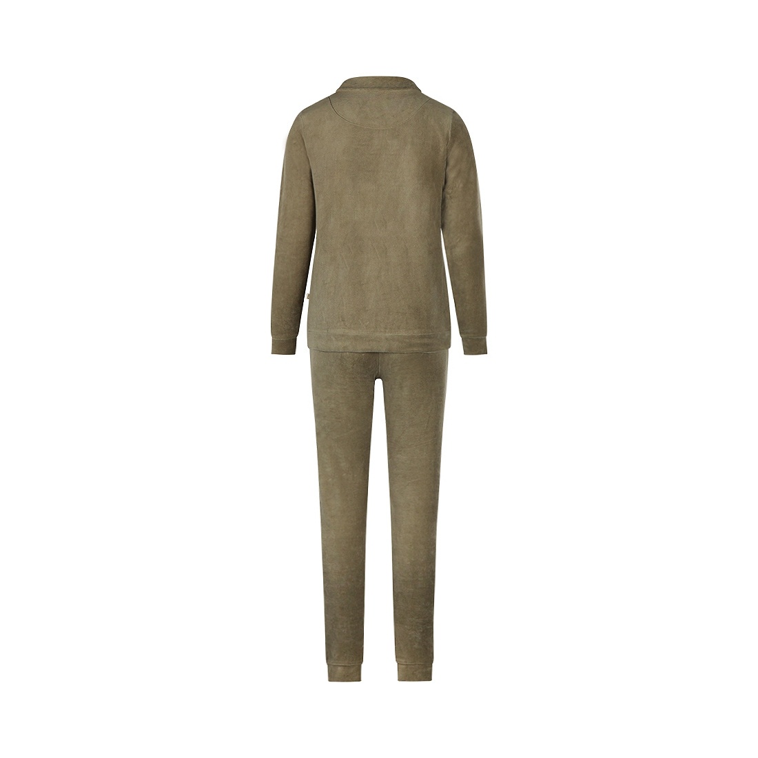 This women's pyjama set from Charlie Choe in a greyish green shade is ultra-soft and perfect for the cooler seasons. Made from comfortable velour with a sporty zip, kangaroo pocket and cuffs on the sleeves and legs. The homewear set exudes relaxed luxury, perfect for lounging around in as a tracksuit, or for warming up and completely unwinding.