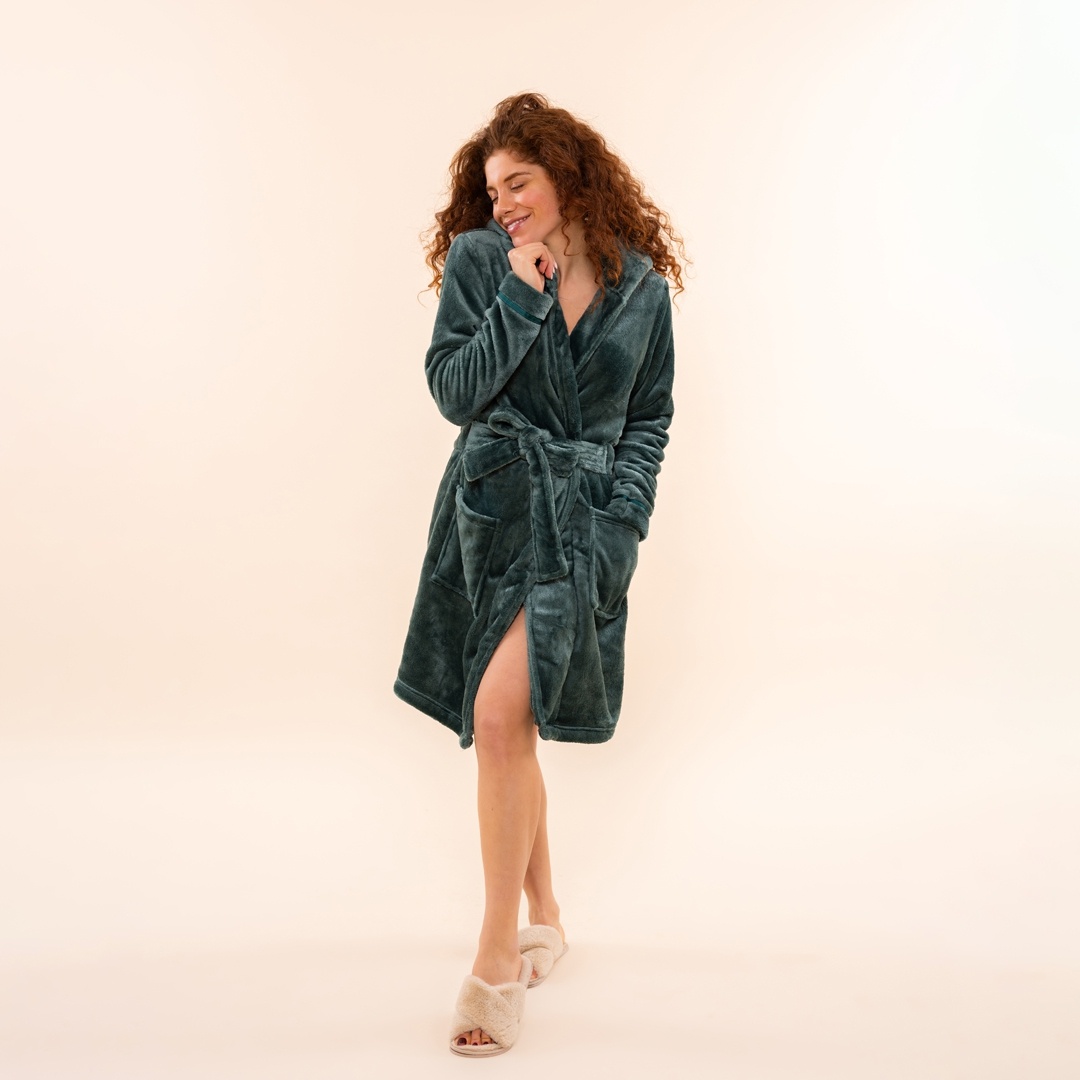 Deze luxueuze blauwgroene Charlie Choe badjas is gemaakt van heerlijk zacht fleece en voelt als een warme omhelzing. Voorzien van een capuchon, grote opgestikte zakken en een brede ceintuur om de taille zorgt deze korte dames badjas voor optimaal comfort. Perfect om ’s ochtends in op te starten of ’s avonds in tot rust te komen. Warm, stijlvol en onweerstaanbaar zacht.
