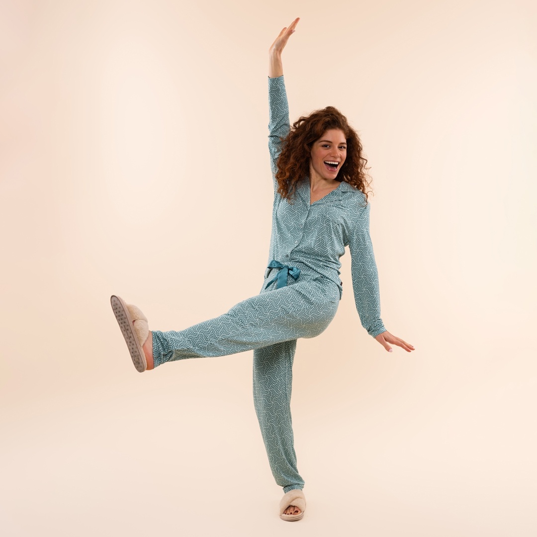 Deze lichtblauwe pyjamaset van Charlie Choe is perfect voor wie houdt van zacht, luchtig en toch verzorgd. De dames pyjamaset is gemaakt van een heerlijk zachte modalmix (95% modal, 5% elastaan) voor ultiem comfort en bestaat uit een klassiek doorknoopshirt met kraag en een fijne pyjamabroek. De mooie grafische all-over print geeft een moderne twist aan deze tijdloze pyjama. Perfect voor rustige nachten en ontspannen ochtenden met een kopje thee.